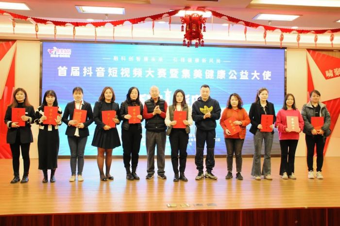 赛博体育saibo家纺首届抖音短视频大赛的获奖者上台领奖。